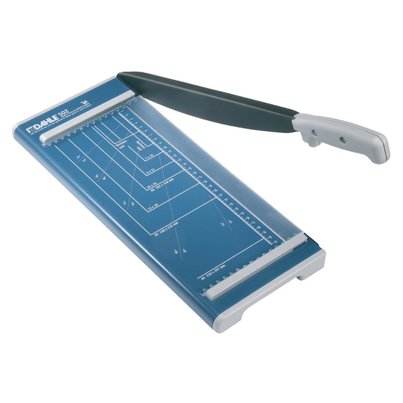Cutter DAHLE 502 Stable metal base. Steel blade. There is a ruler and paper format markings on the base. Right-angle rulers. DIN format: A4. Cutting length: 320 mm. Cutting thickness: 0.8 mm. Work surface size: 420 x 175 mm. Weight 1.2 kg.