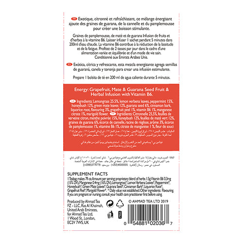 Dėžutėje yra 20 arbatos maišelių su siūlu, kad lengvai pasigamintumėte arbatos puodelyje. Kiekvienas arbatos maišelis įdėtas į foliją, kad ilgiau išliktų skonis, o užpilas būtų gaivus. Norint pradėti dieną „su trenksmu“, puodelis „Ahmad Tea“ „Energy Infusion“ arbatos yra puikus pasirinkimas.