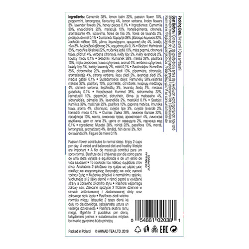 Kurdami šį miegą gerinantį užpilą, mūsų arbatos meistrai patirties sėmėsi iš gamtos. Ramunėlės, kurios visame pasaulyje yra vertinamos dėl natūralių ir raminamųjų savybių, yra puikus užpilo pagrindas. Užpilą papildėme kvapniu citrinų balzamu, kad suteiktume pievų aromato. Šios švelnaus skonio sudedamosios dalys pabrėžiamos levandų, liepų ir pasiflorų gėlių, kurios šimtmečiais garsėja kaip turinčios raminamąjį ir atpalaiduojantį poveikį, aromatais. Pabaigoje mišinys papildomas džiovinto medaus gabalėliais. Natūralus ramunėlių priedas medus tirpsta užpile, suteikdamas jam malonaus auksaspalvio saldumo. Šio nuostabaus gėrimo puodelis padės greitai užmigti. Užpilas, pagamintas iš visiškai natūralių sudedamųjų dalių, leis pabudus ryte puikiai jaustis.