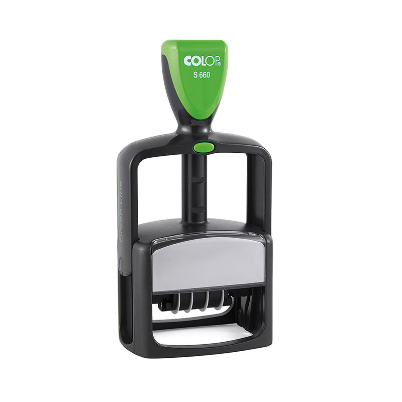 Antspaudas S660 Green Line D03 COLOP, DD.MMM.YYYY, su mėlyna pagalvėlė