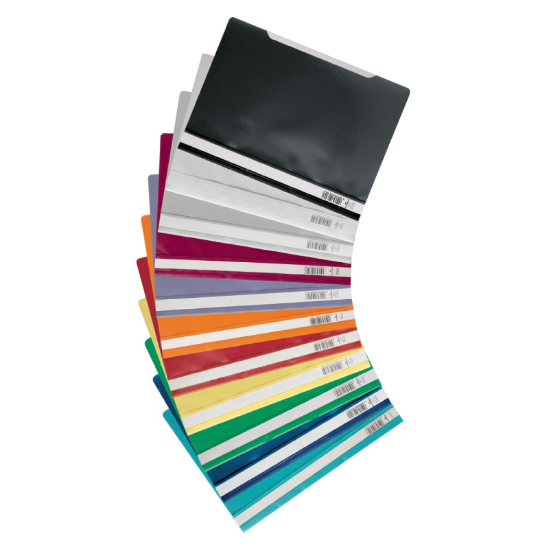Skaidrus viršelis. Pagamintas iš spalvoto propileno. Ilga juostelė užrašui. Galima susegti iki 30 lapų. Oranžinės spalvos. Dėžutėje - 50 vnt.
