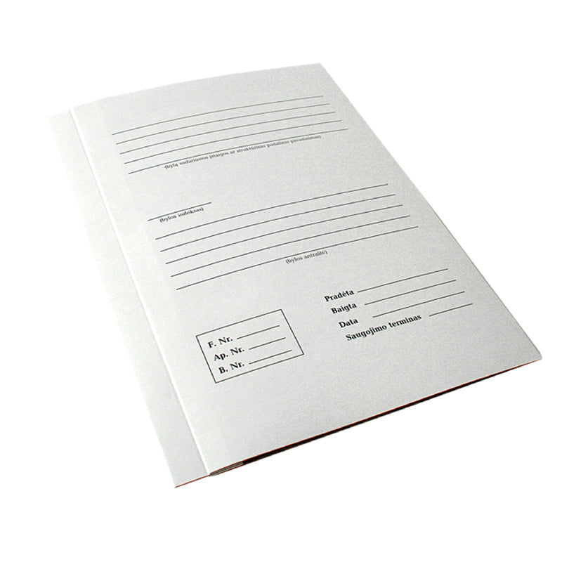 Pagamintas iš perdirbto kartono. Su raišteliais viduje. Pigus būdas dokumentams nešioti, archyvuoti. A4 formatas. Galima įdėti 370 – 430 lapų. Klijuota nugarėlė 4 cm. Baltai pilka spalva. Gramatūra - 300 g/m2.
