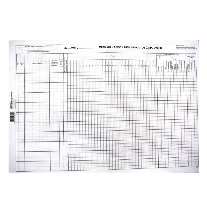Buhalteriniai blankai Darbo laiko apskaitos žiniaraštis. A3 D formatas. Pakuotėje 10 vnt.