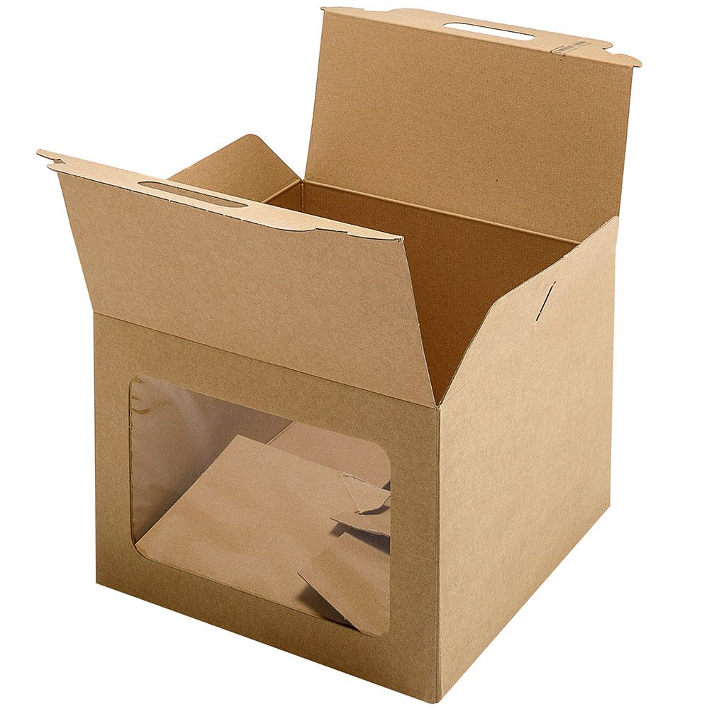 Kartoninė dėžutė su skaidriu langeliu ir rankenėlėmis puikiai tinka stiklinių indelių, žvakių, rinkinių ar kitų produktų pakavimui.