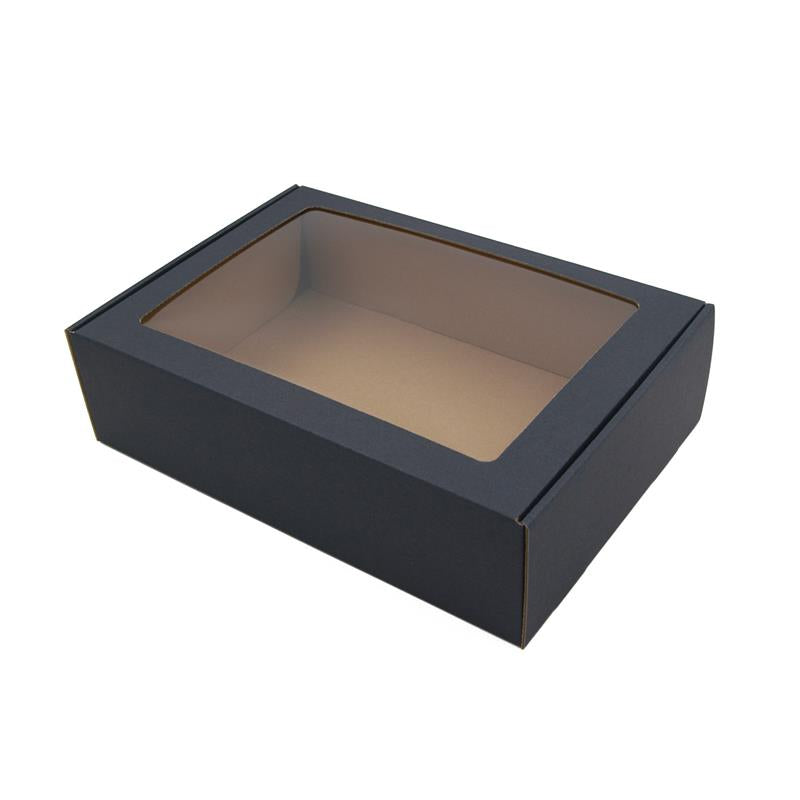 Juoda dovanų dėžutė su skaidriu langeliu. Standi, išlaiko formą, galima dėti sunkesnius daiktus. Tinka reprezentacijai, verslo dovanoms pakuoti.