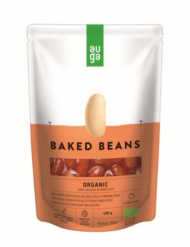 Ekologiškos pupelės AUGA baltosios konservuotos pomidorų padaže 400g, LT-EKO-001