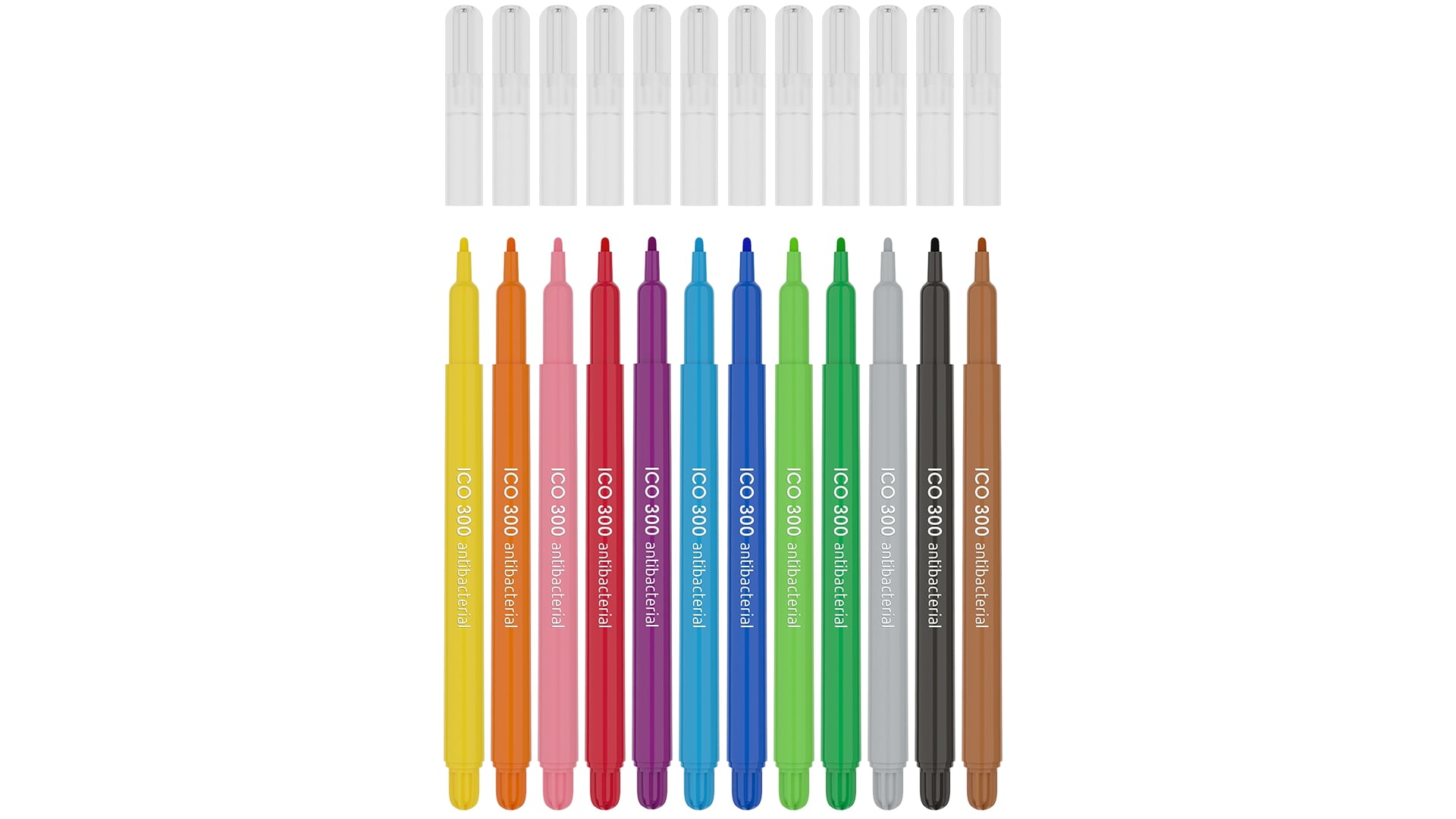 Antibakterinio pluošto flomasteriai ICO, 12 spalvų pakuotė. Flomasteriai užpildyti vandens pagrindo rašalu bei turi apsauginį ventiliacinį kamštelį. Skirti piešimui ir spalvinimui. Plastikinių dalių sudėtyje yra Biomaster sidabro jonų, kurie suteikia antibakterinę apsaugą (biocidinė veiklioji medžiaga: sidabro fosfato stiklas). ICO antibakteriniai produktai turi baktericidinių savybių, o mikrobai nužudomi per 24 valandas, 99,9% efektyvumu. Antibakterinį aktyvumą išbandė ir patvirtino Industrial Microbiological Services Ltd. Registracijos numeris: 3264423.