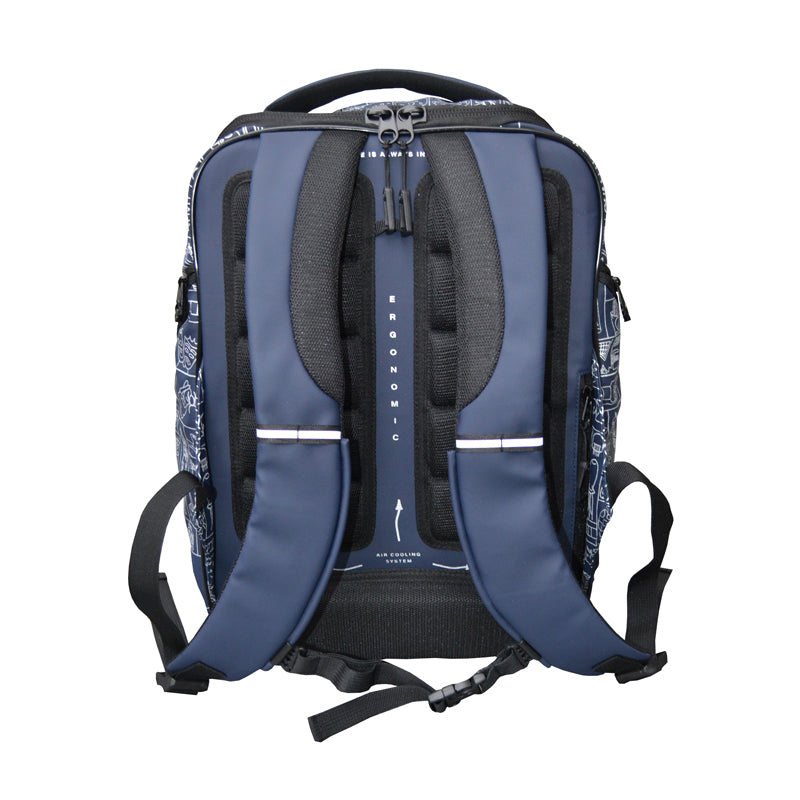 • Ergonominė nugarinė dalis – platūs, paminkštinti ergonominės formos diržai paskirsto svorį, o tinklelinė medžiaga leidžia „kvėpuoti“, pakietinta dalis padeda išlaikyti tiesią nugarą, papildomas diržas ant krutinės – sumažins kuprinės spaudimą nugarai.