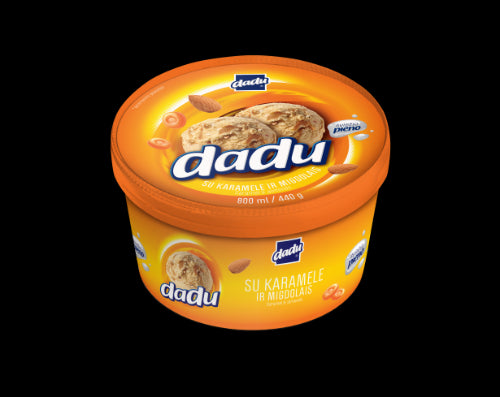 Grietininiai valgomieji ledai DADU karamelės skonio su karemelės įdaru ir kepintais migdolais 440g