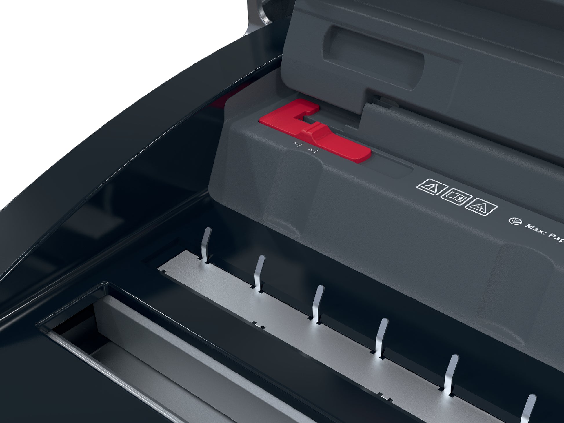 • Patogus iškarpų dėklas ir įmontuota laikymo vieta geresniam darbo organizavimui.