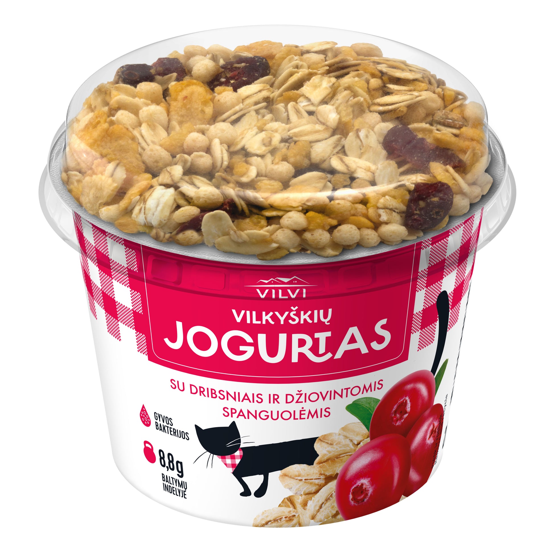 • Sudėtis: pasterizuotas nugriebtas pienas, dribsnių mišinys su džiovintomis spanguolėmis 10 % (dangtelyje: avižiniai dribsniai 50 %, skrudinti miežių dribsniai 27 % miežiai 94 %, cukrus, valgomoji druska, miežių salyklo ekstraktas, emulsiklis riebalų rūgščių mono- ir digliceridai), avižų kviečių kukurūzų ekstrudatai su skaidulomis 13 % avižų miltai 31 %, kviečių miltai 15%, avižų skaidulos, maistinės skaidulos 12,7 %, cukrus, kukurūzų kruopos, kviečių sėlenos, palmių aliejus, valgomoji druska, lipnumą reguliuojanti medžiaga kalcio karbonatas), džiovintos spanguolės 10 % (cukrus, spanguolės, ryžių miltai, saulėgrąžų aliejus)), grietinėlė, cukrus, modifikuotas kukurūzų krakmolas, pieno baltymai, želatina, tirštiklis: pektinai, jogurtinės bakterijos.