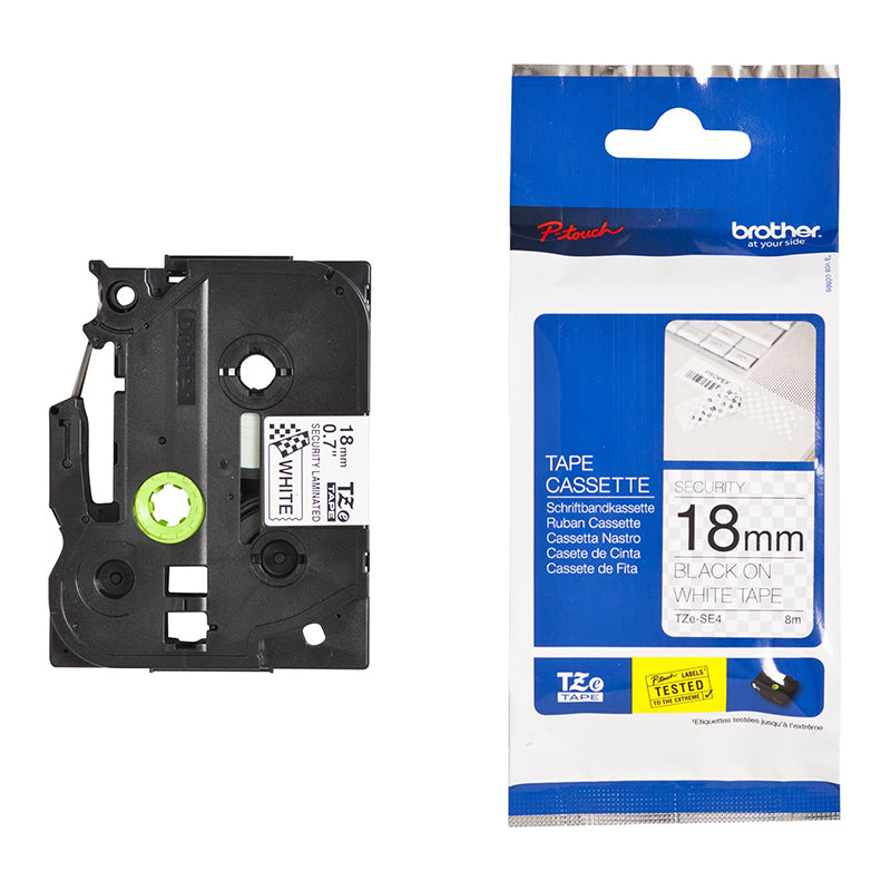Juostelė BROTHER TZE-SE4, 18 mm x 8 m, apsauginė, juodai ant balto