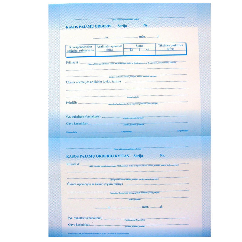 Buhalteriniai blankai Kasos pajamų orderis. A4 formatas. Pakuotėje 50 vnt. Su Eurais.