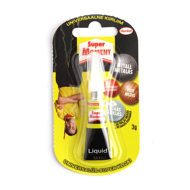 SUPER MOMENT greitai džiūstantys stiprios fiksacijos klijai Gerai klijuoja porcelianą, plastmasę, metalą, gumą, odą, medį, kamštį ir kitas medžiagas. Momentinė sukibimo jėga. Saugus kamštelio atidarymas. Talpa 3 g. Dėžutėje 12 vnt.