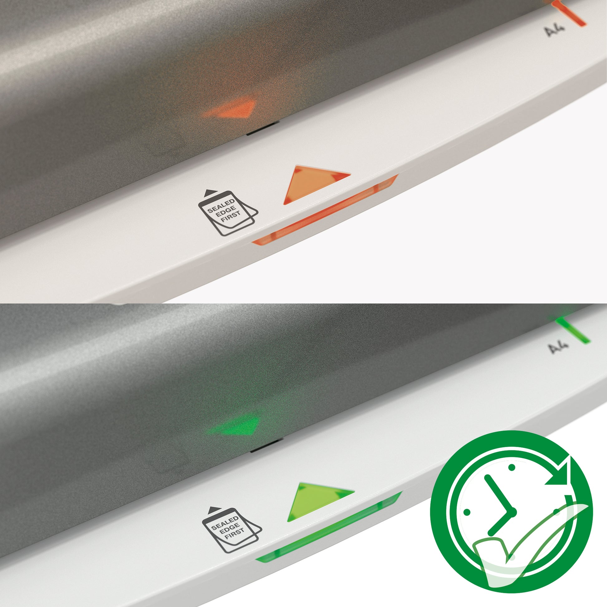 • Išmanioji LED būsenos indikacija: raudona spalva įkaitimo metu, žalia spalva su garsiniu signalu, kai laminatorius paruoštas naudoti.