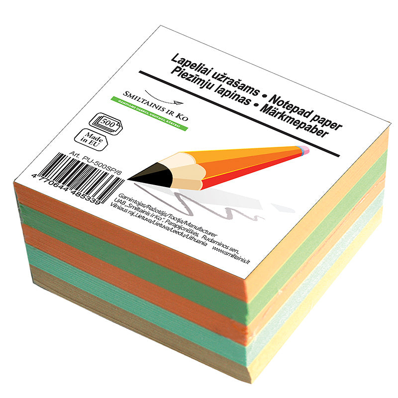 Papildomi lapeliai užrašams. Įvairių spalvų. Matmenys 80 x 80 mm. Pakuotėje 500 lapelių.