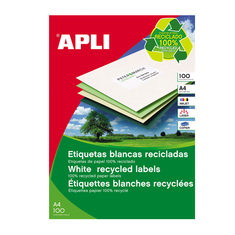 Lipnios etiketės APLI, 70 x 37 mm, A4, perdirbti, 24 lipdukai lape, 100 lapų, balta
