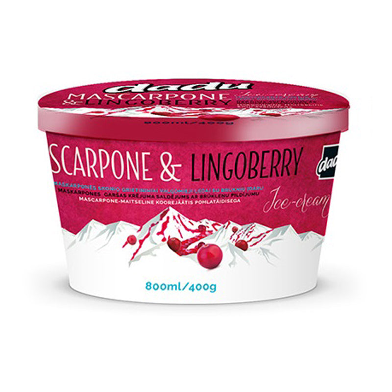 Maskarponės skonio grietininiai valgomieji ledai DADU, su bruknių įdaru, 800 ml