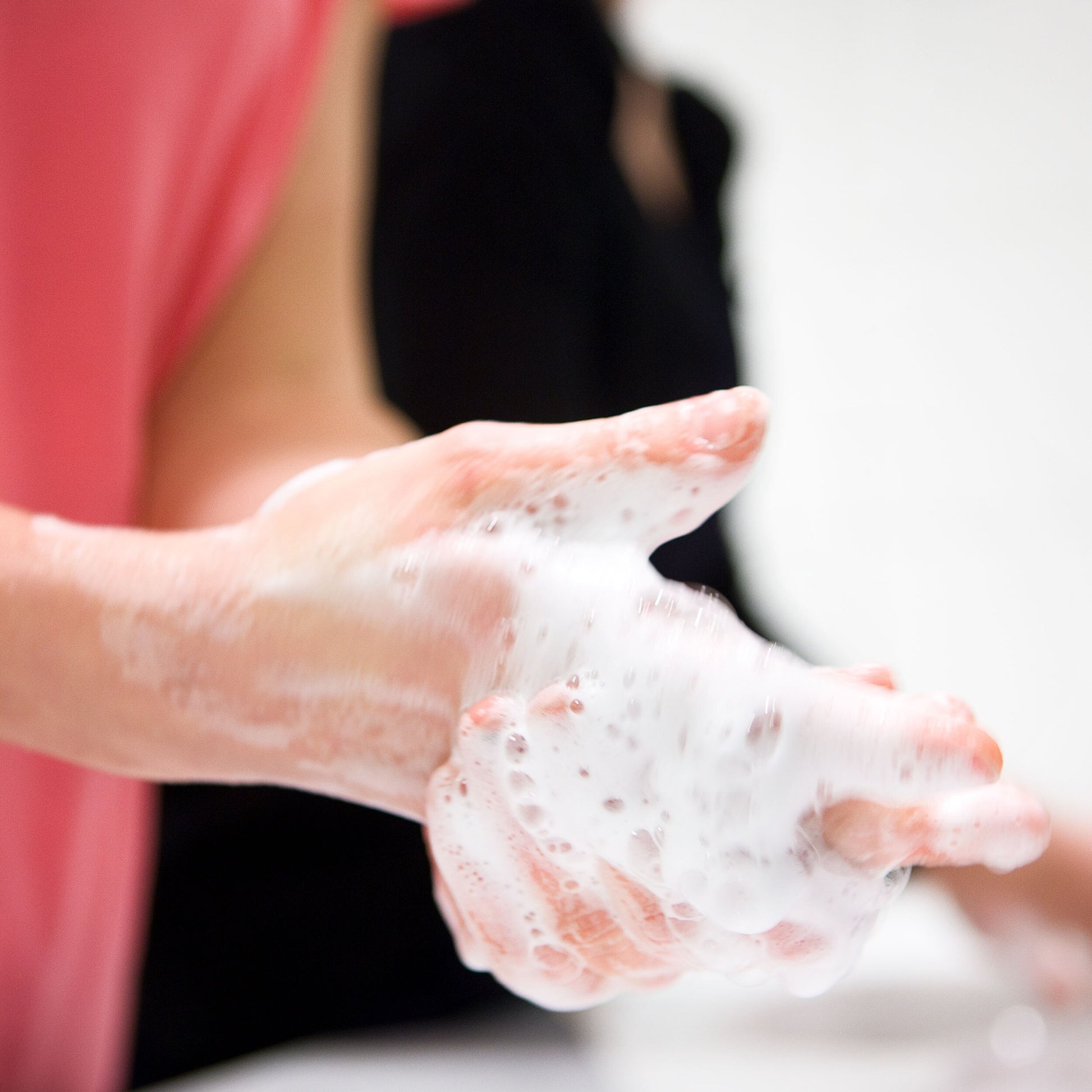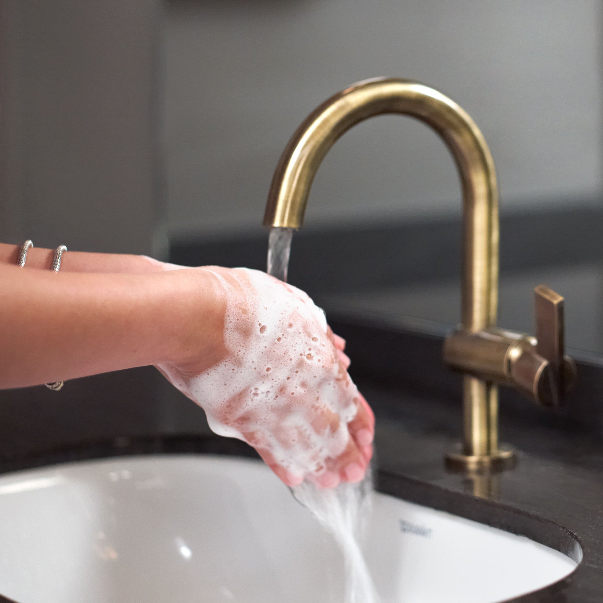 • Vienu metu usiplausite ir dezinfekuosite rankas.