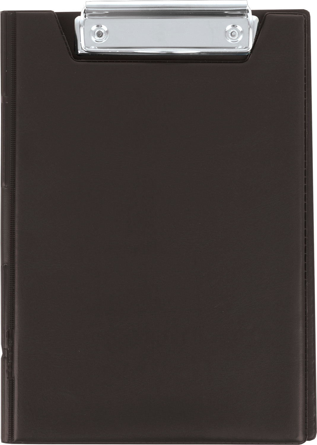 Rašymo pagrindas su atvartu. Su metaliniu spaustuku viršuje bloknotui laikyti. Atverčiamas viršus. A5 formatas. Juodos spalvos.