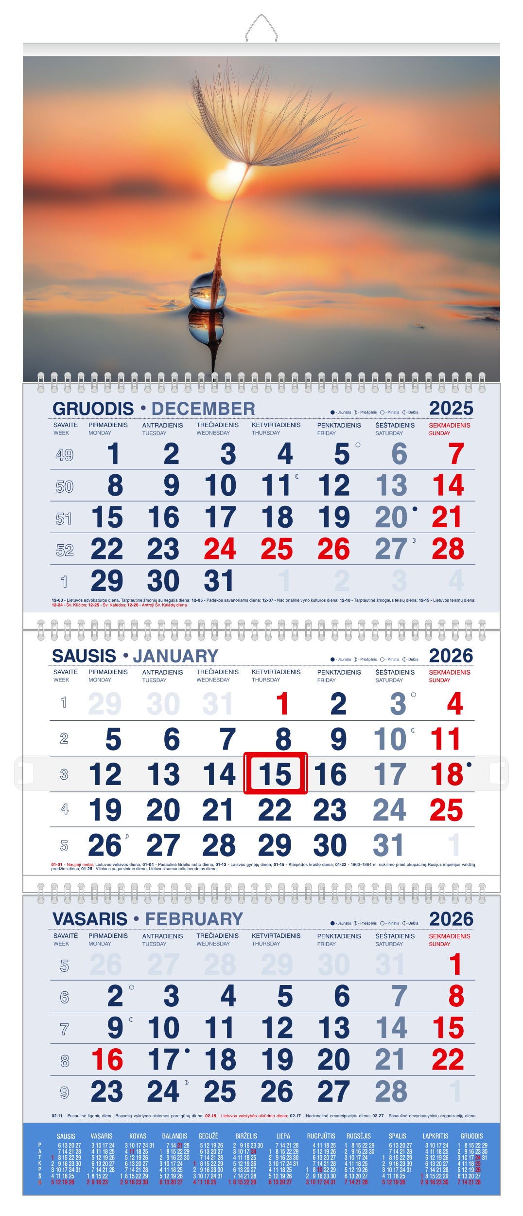 • Kalba: lietuvių, anglų • Sieninis sulankstomas trijų dalių kalendorius • Įrištas 3 spiralėmis, lapai be perforacijos • Dienos žymeklis - slankiojantis langelis datai žymėti • Matmenys: 30,3 x 74 cm • Apatinėje dalyje 12 mėnesių/lapų kalendorius • Metalinė pakabinimo kilpelė