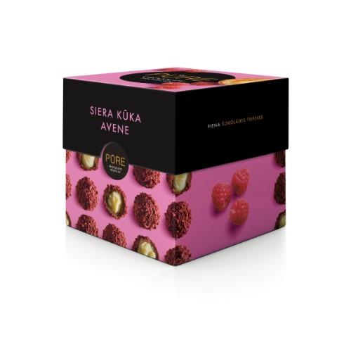 Pieniško šokolado triufeliai PURE su sūrio pyrago skonio grietinėlės užpildu ir avietėmis, 96g
