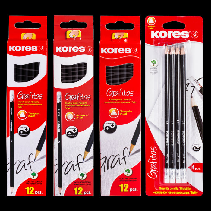 • Kores Grafitos yra aukštos kokybės iš anksto padrožti grafito pieštukai; HB grafitas, su trintuku, puikiai tinkantys biuro ir mokyklos reikmenims.
