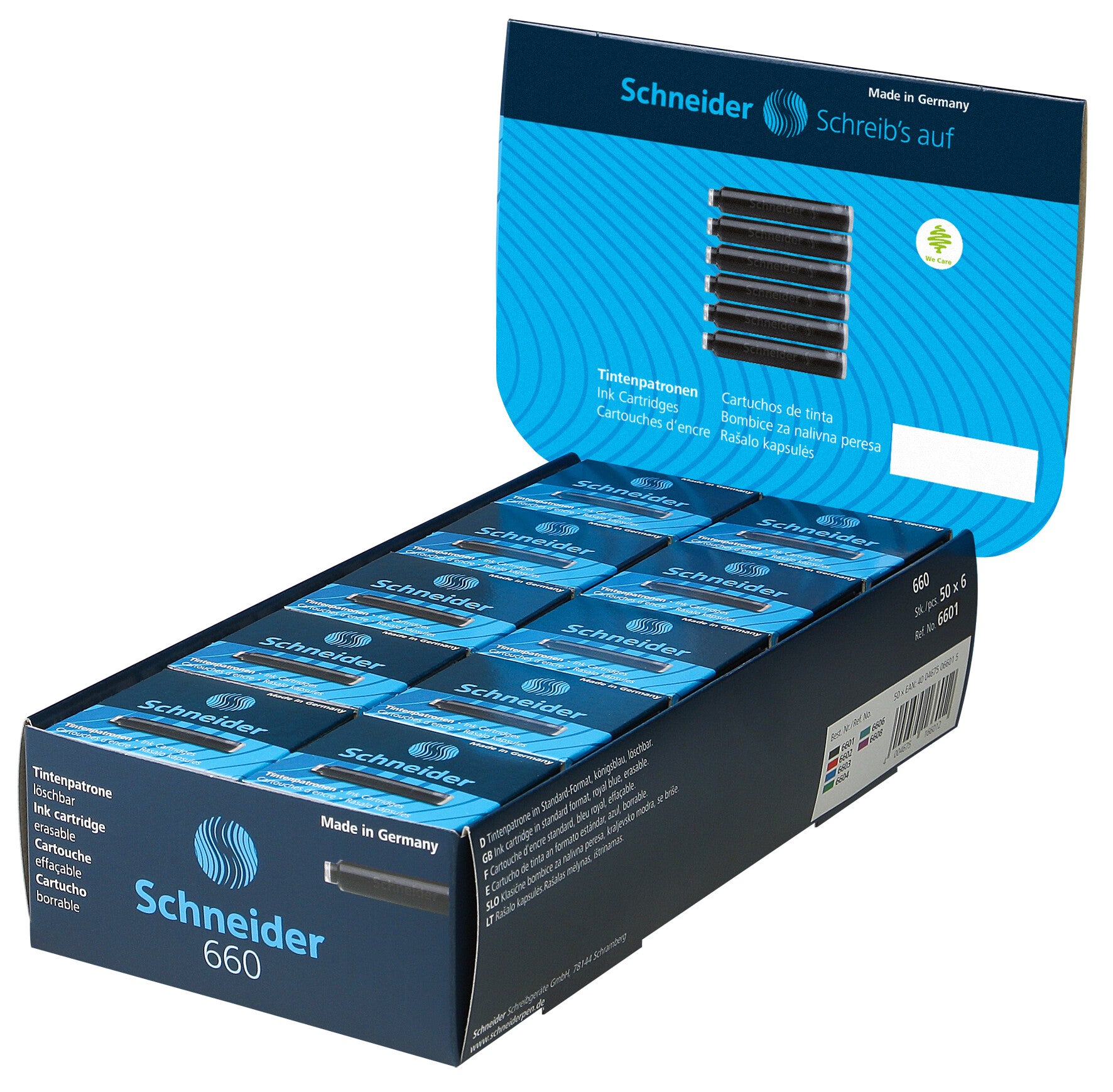 Produkto aprašymas:Dėžutė su 6 standartinėmis rašalo kasetėmis su rutuliniu uždarymu, rašalo spalva ""juoda"". Tinka ""Schneider"" ir daugeliui kitų plunksnakočių bei kasečių ritinėlių.
