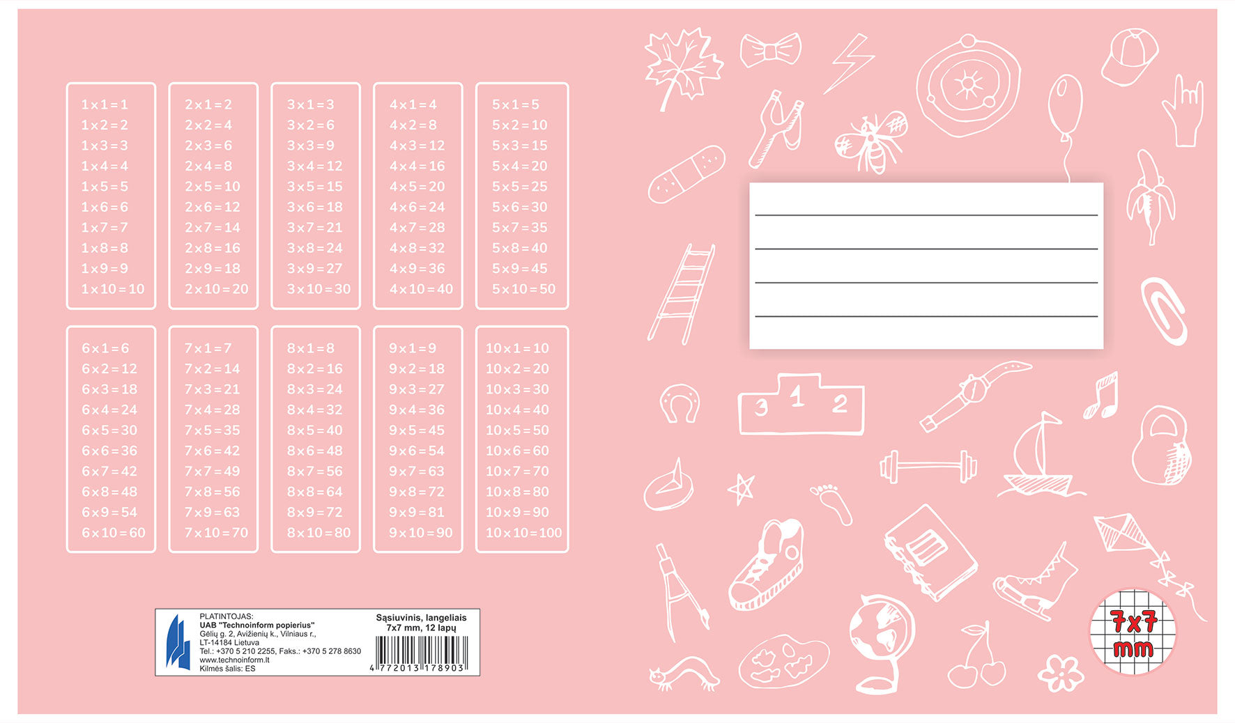 Sąsiuvinis TECHNOINFORM, 1-2 klasei, langeliais (dydis 7x7mm) A5, 12 lapų, vidinių lapų gramatūra 70 gramų, su paraštėmis iš abiejų šonų, mėlynos spalvos linijos. Įvairių spalvų viršeliai.