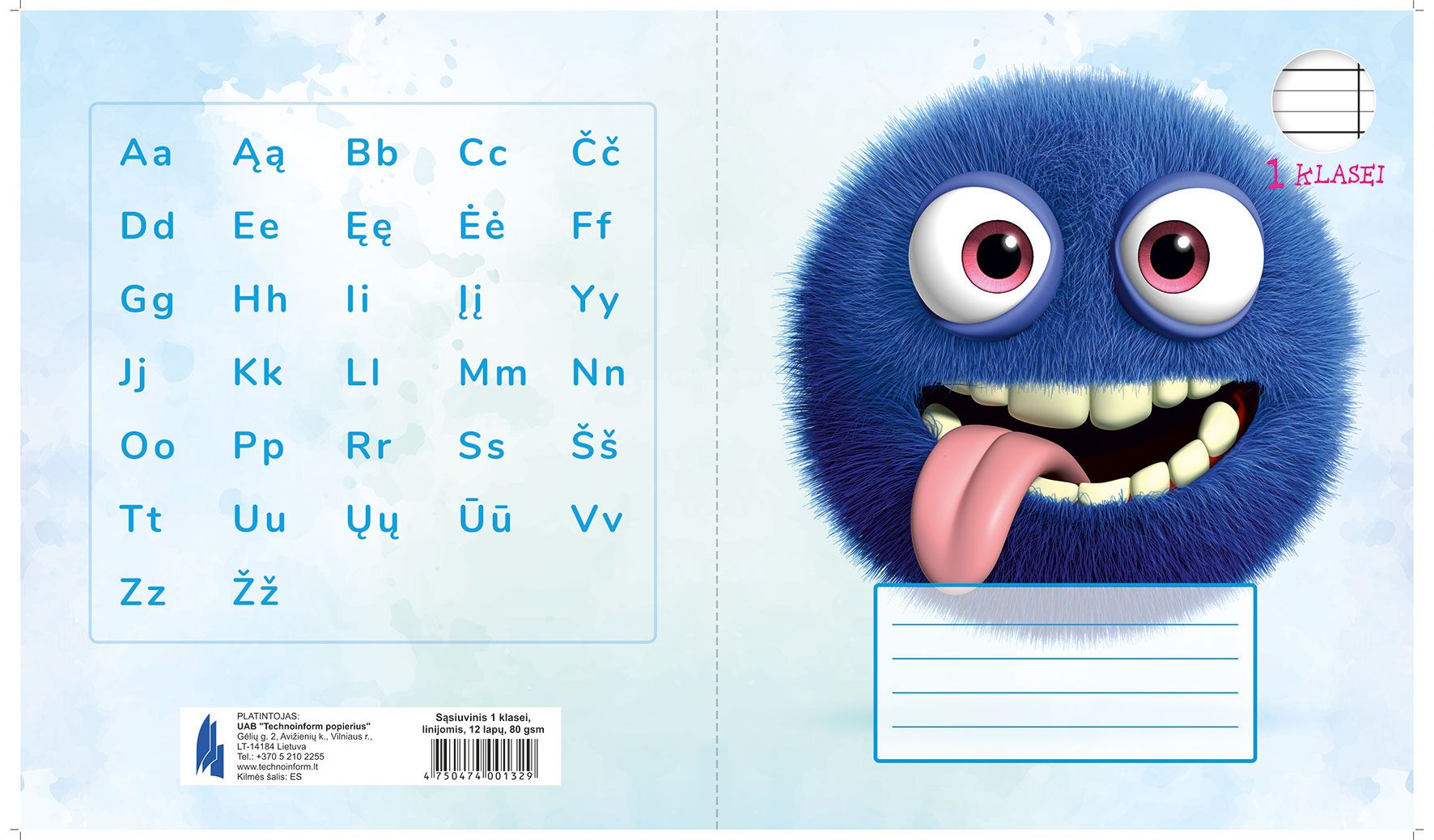 Sąsiuvinis TECHNOINFORM, 1 klasei, linijomis, A5, 12 lapų, vidinių lapų gramatūra 80 gsm. su paraštėmis iš abiejų šonų, mėlynos spalvos linijos. Skirtingų spalvų viršeliai.