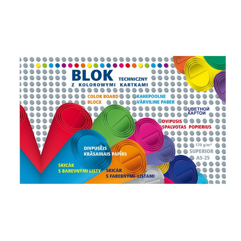A5 formatas, 25 skirtingų spalvų lapai, storis 170 g/m2. Dėžėje 10 vnt.