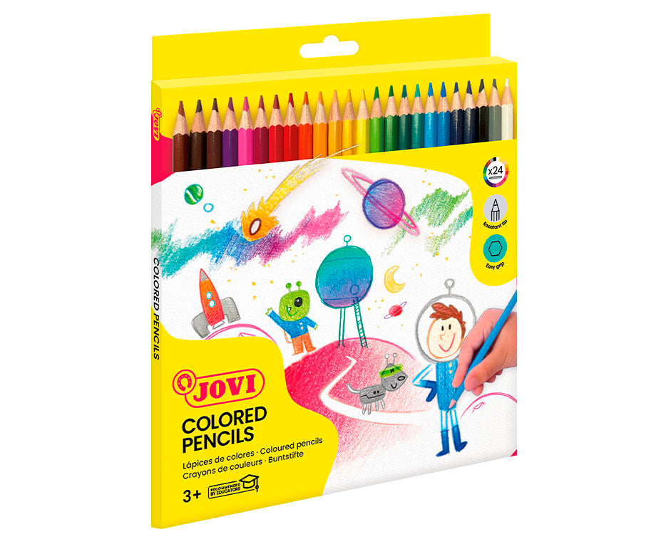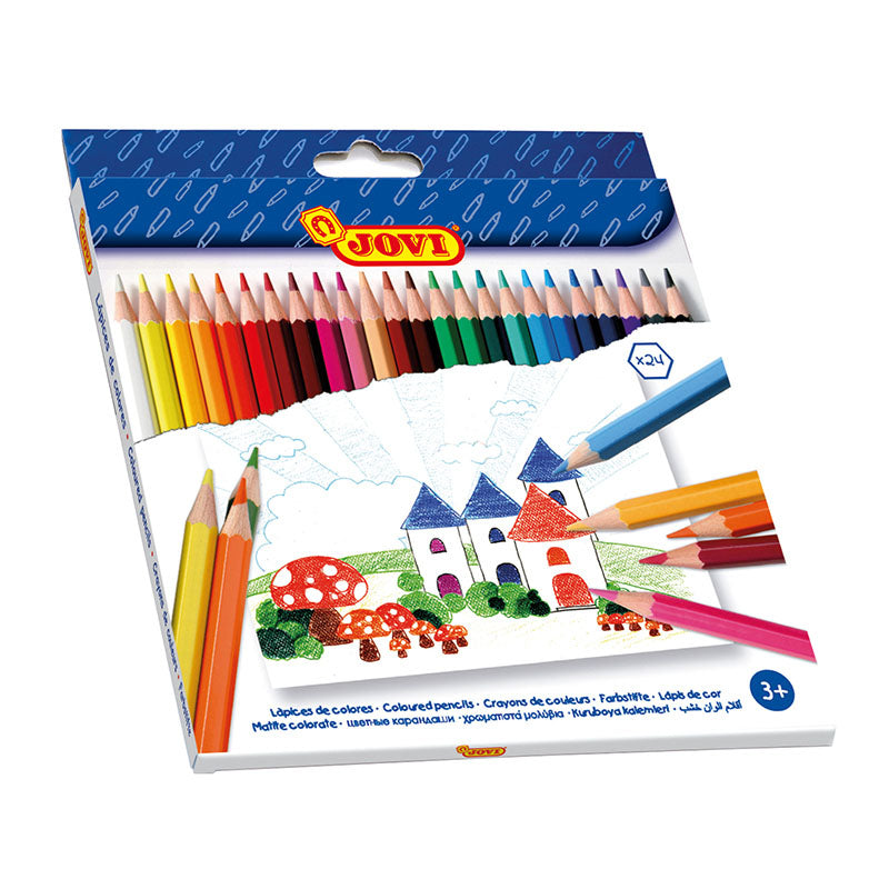 Spalvoti pieštukai JOVI. Puikios kokybės padrožti mediniai pieštukai. Netoksiški. Netepa rankų, lengvai padrožiami. Ryškios spalvos. Ilgis 175mm, diametras 7mm. Dėžutėje 24 skirtingų spalvų vienetai.