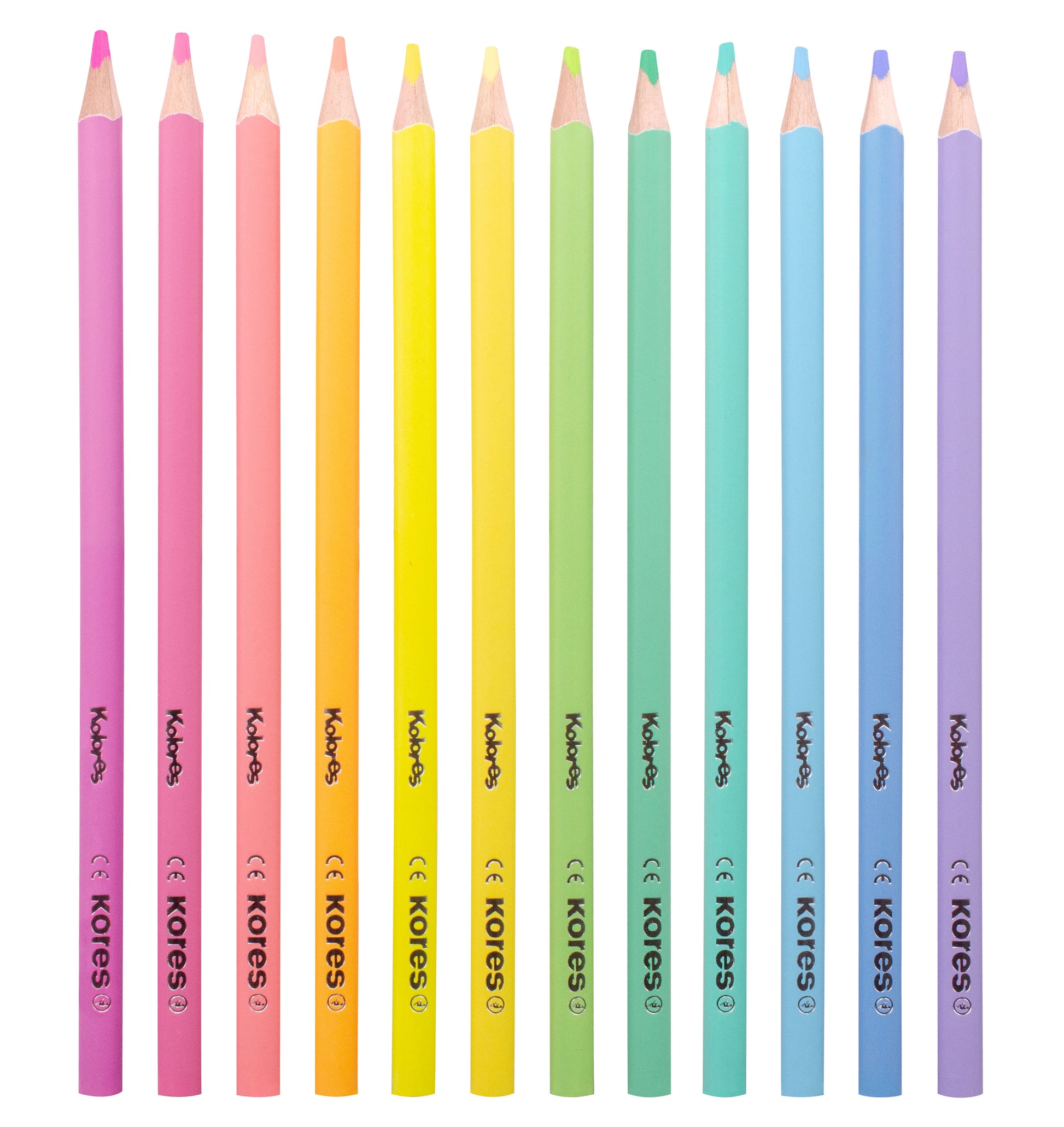 Spalvoti pieštukai KORES KOLORES PASTEL, tribriauniai, 3mm, 12 pastelinių spalvų