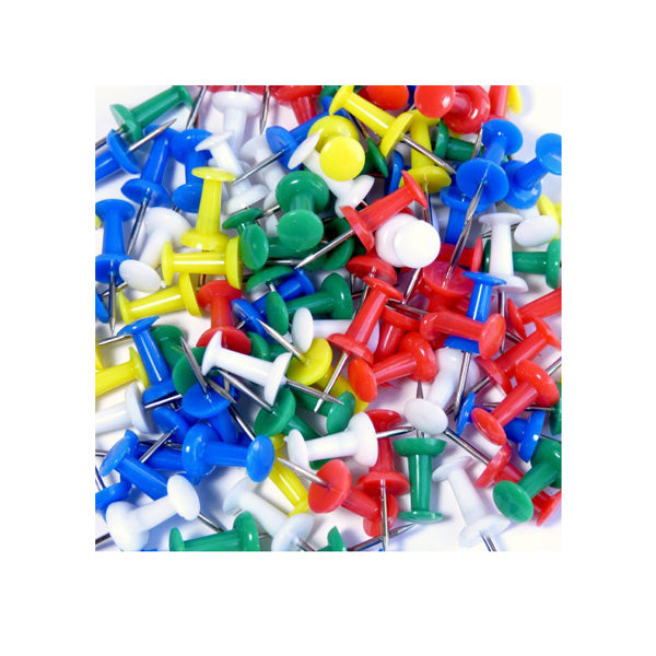 Spalvoti. Skirti kamštinei lentai. Plastikine galvute. Dėžutėje 100 vnt.