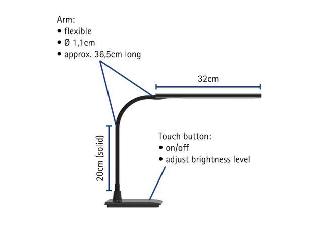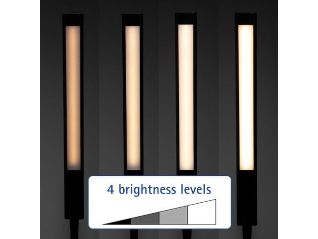 Pritemdomas ( 4 lygių) LED šviestuvas. Lanktus kotas leidžia reguliuoti apšvietimo kampą.