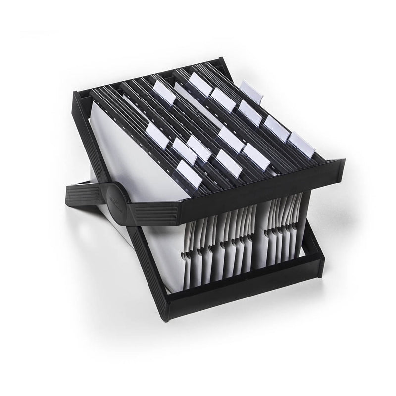 Patrauklus dizainas, stovas stiprus ir stabilus. Nedidelio svorio - lengvai perkeliamas. Platus suvėrimas, lengvai sumontuojamas. Pagaminta iš 80% perdirbto plastiko. Blue Angel sertifikatas. Stovas su vokais telpa i darbo stalo stalčius. Dydis: 260 x 362 x 320 mm. Gali sutalpinti apie 30 kartotekinių vokų. Tamsiai pilkos anglies spalvos, pakuojamas po vieną vienetą.