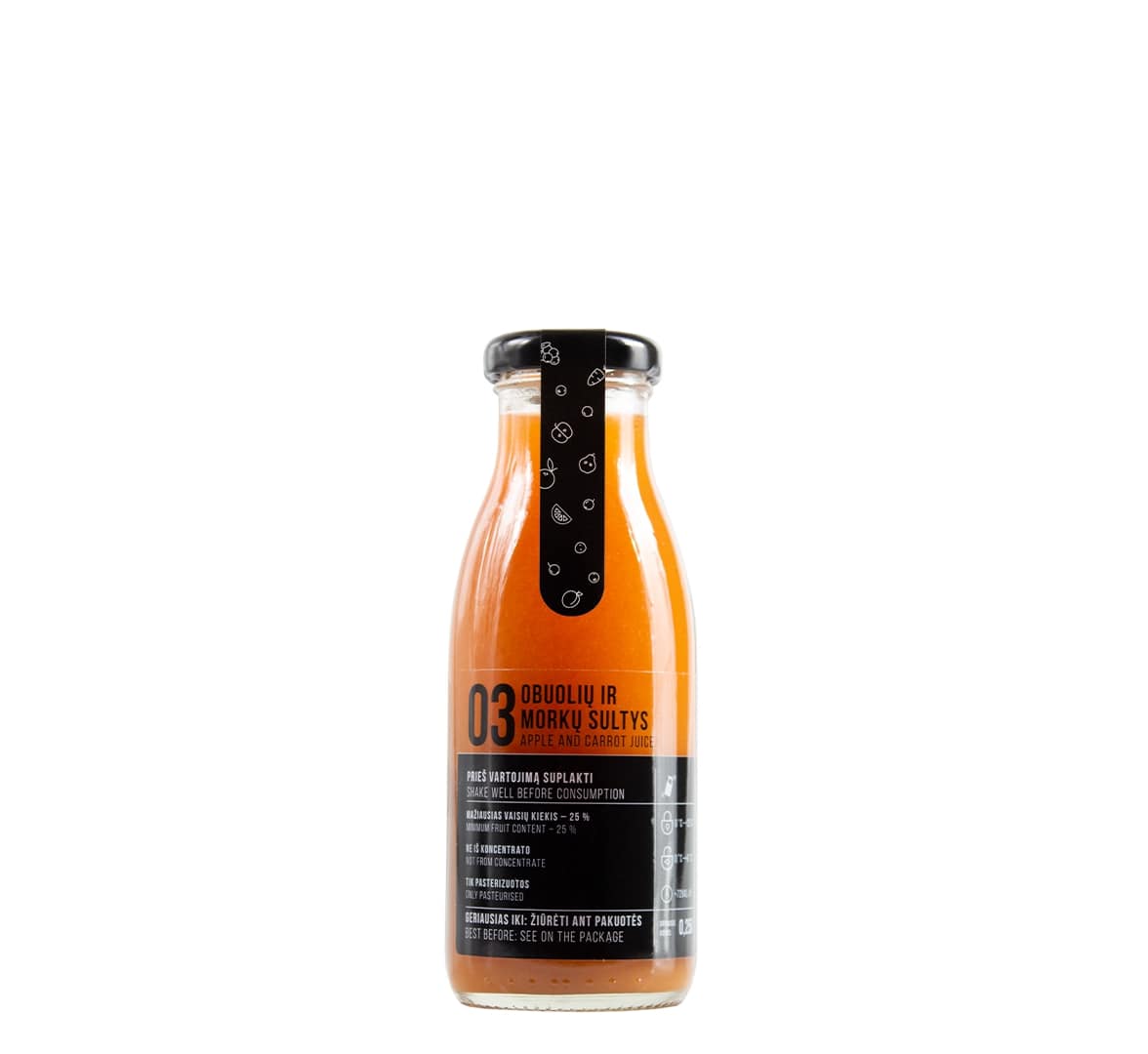 Sudėtis: obuolių sultys 90%, morkų tyrė 10%, antioksidantas vitaminas C.