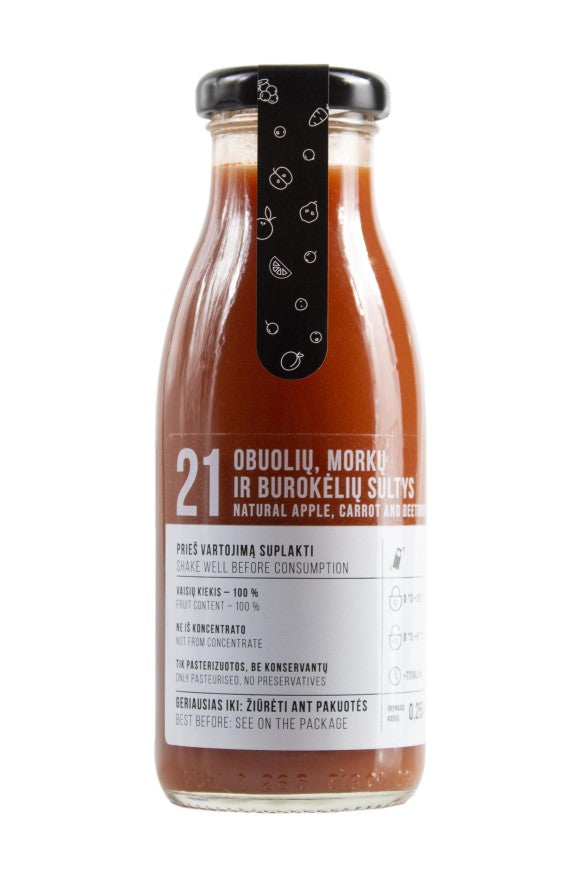 Sudėtis: obuolių sultys 70%, morkų tyrė 20%, burokėlių sultys 10%.