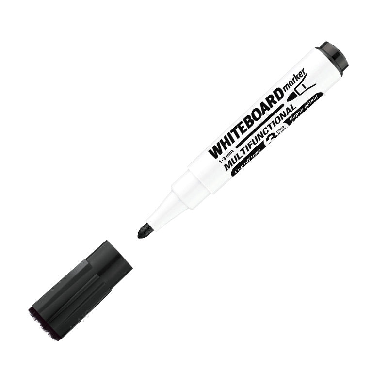 Juodos spalvos. Apvali galvutė. Brėžio storis 3 mm. Multifunkcionalus: žymeklis baltai lentai, trintukas, magnetinis kamštukas, kuris prilimpa prie magnetinės rašomosios lentos. Dėžutėje 10 vnt.