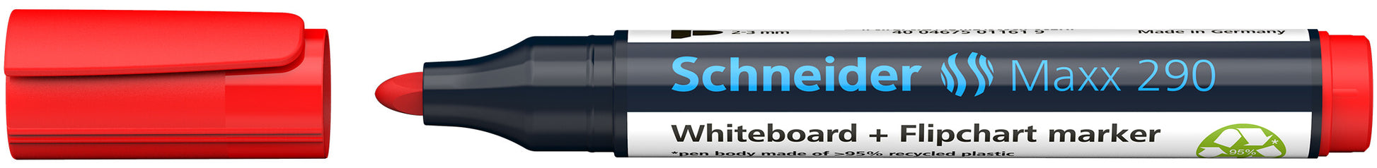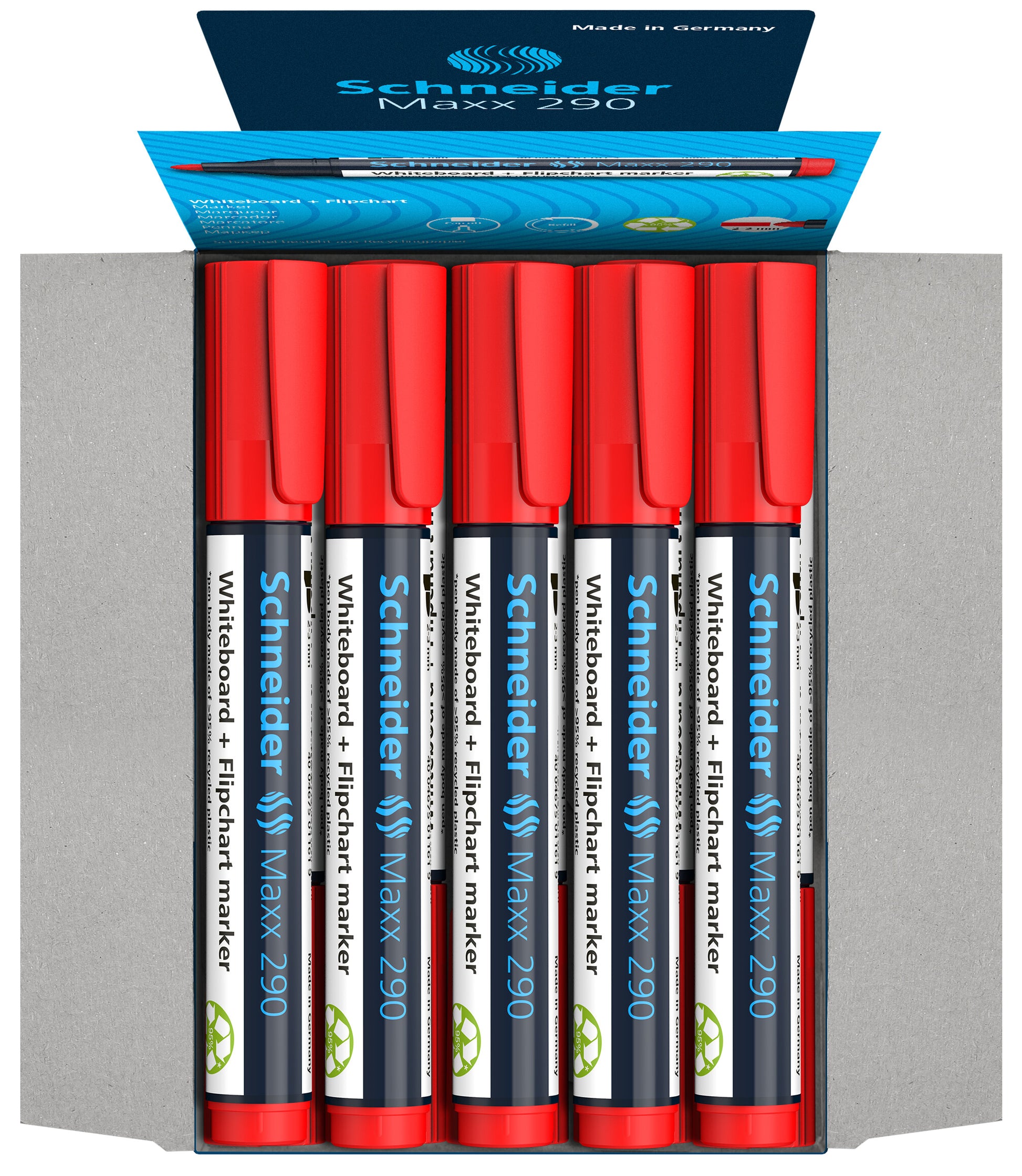Produkto aprašymas:2-3 mm pločio linijos pločio žymeklis, skirtas rašyti ant baltos lentos ir flipchartų. Rašymo spalva raudona. * Korpusą sudaro 95 % perdirbto plastiko. Nesvarbu, ar ant lentos, ar ant popieriaus, ryškios, gyvos spalvos yra lengvai įskaitomos net ir iš kambario galo. Rašalą nuo lentos galima nuvalyti sausu skudurėliu nepaliekant likučių, o ant flipchartų rašalas neprasiskverbia į apačioje esantį puslapį. Dangteliais užsukamas rašalas neišsilaiko, net jei dangtelis nuimamas 2-3 dienas. Jis yra silpno kvapo, be toluolio ir ksilolio. Naujajame didesnio tūrio formate yra daugiau rašalo, kad rašymas būtų maksimaliai našus, o naujasis kulkos formos antgalis rašo maloniai minkštai, neskleisdamas girgždėjimo garsų. Rašiklis ""Maxx 290"" turi praktišką užspaudžiamą dangtelį ir gali būti pildomas naudojant ""Maxx 665"" pildymo stotelę.