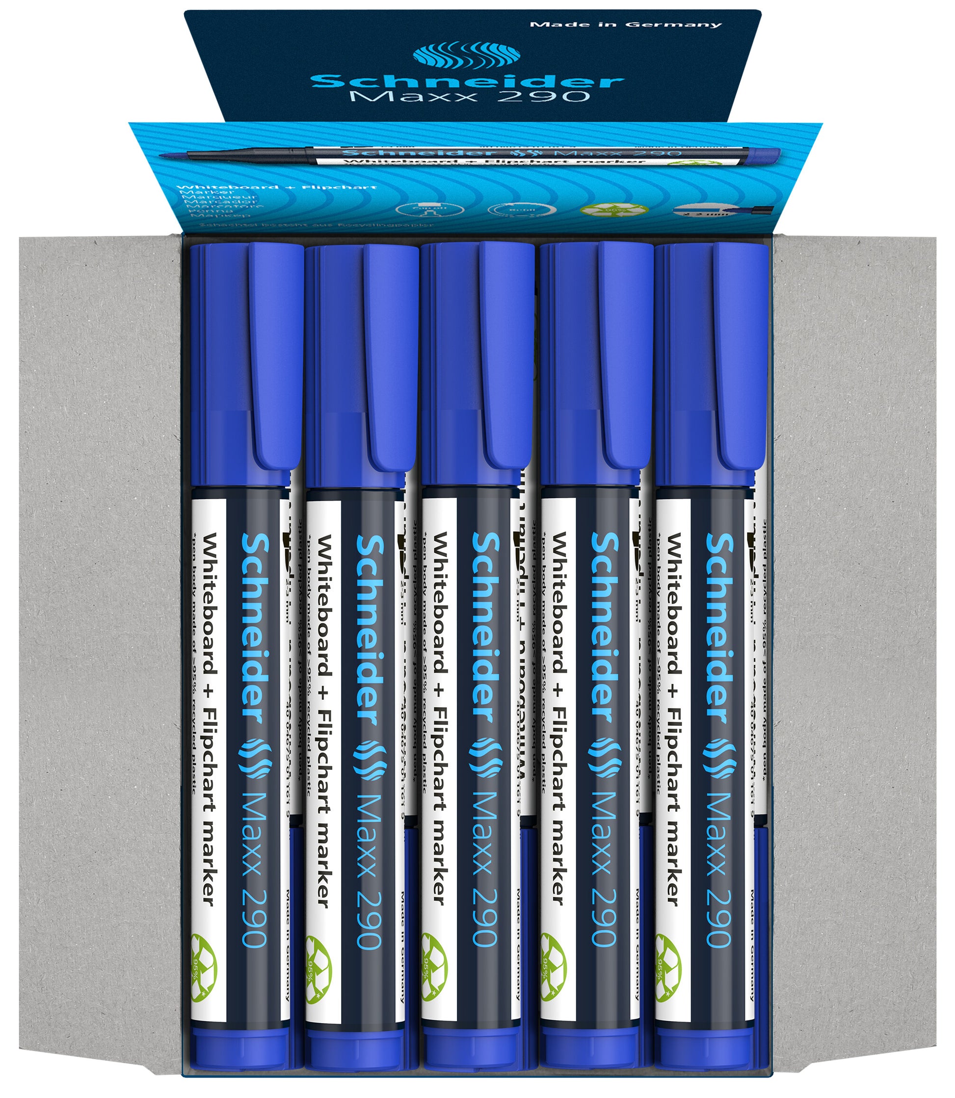 Produkto aprašymas:2-3 mm pločio linijos pločio žymeklis, skirtas rašyti ant baltos lentos ir flipchartų. Rašymo spalva mėlyna. * Korpusą sudaro 95 % perdirbto plastiko. Nesvarbu, ar ant lentos, ar ant popieriaus, ryškios, gyvos spalvos yra lengvai įskaitomos net ir iš kambario galo. Rašalą nuo lentos galima nuvalyti sausu skudurėliu nepaliekant likučių, o ant flipchartų rašalas neprasiskverbia į apačioje esantį puslapį. Dangteliais užsukamas rašalas neišsilaiko, net jei dangtelis nuimamas 2-3 dienas. Jis yra silpno kvapo, be toluolio ir ksilolio. Naujajame didesnio tūrio formate yra daugiau rašalo, kad rašymas būtų maksimaliai našus, o naujasis kulkos formos antgalis rašo maloniai minkštai, neskleisdamas girgždėjimo garsų. Rašiklis ""Maxx 290"" turi praktišką užspaudžiamą dangtelį ir gali būti pildomas naudojant ""Maxx 665"" pildymo stotelę.